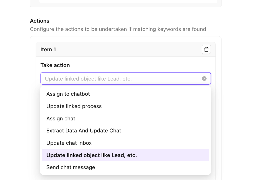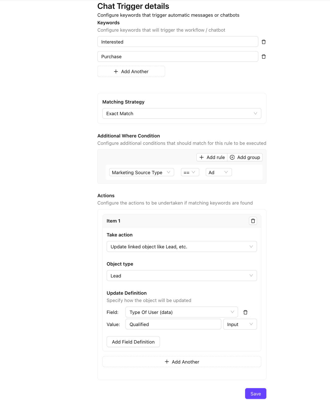 Add relevant keyword or multiple keywords to trigger a particular action - Select the Matching Strategy