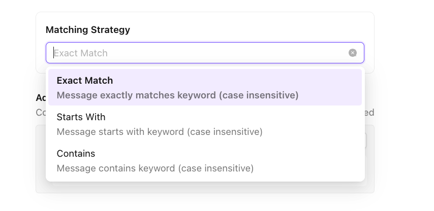 - Exact Match (Message exactly matches keyword - case insensitive)