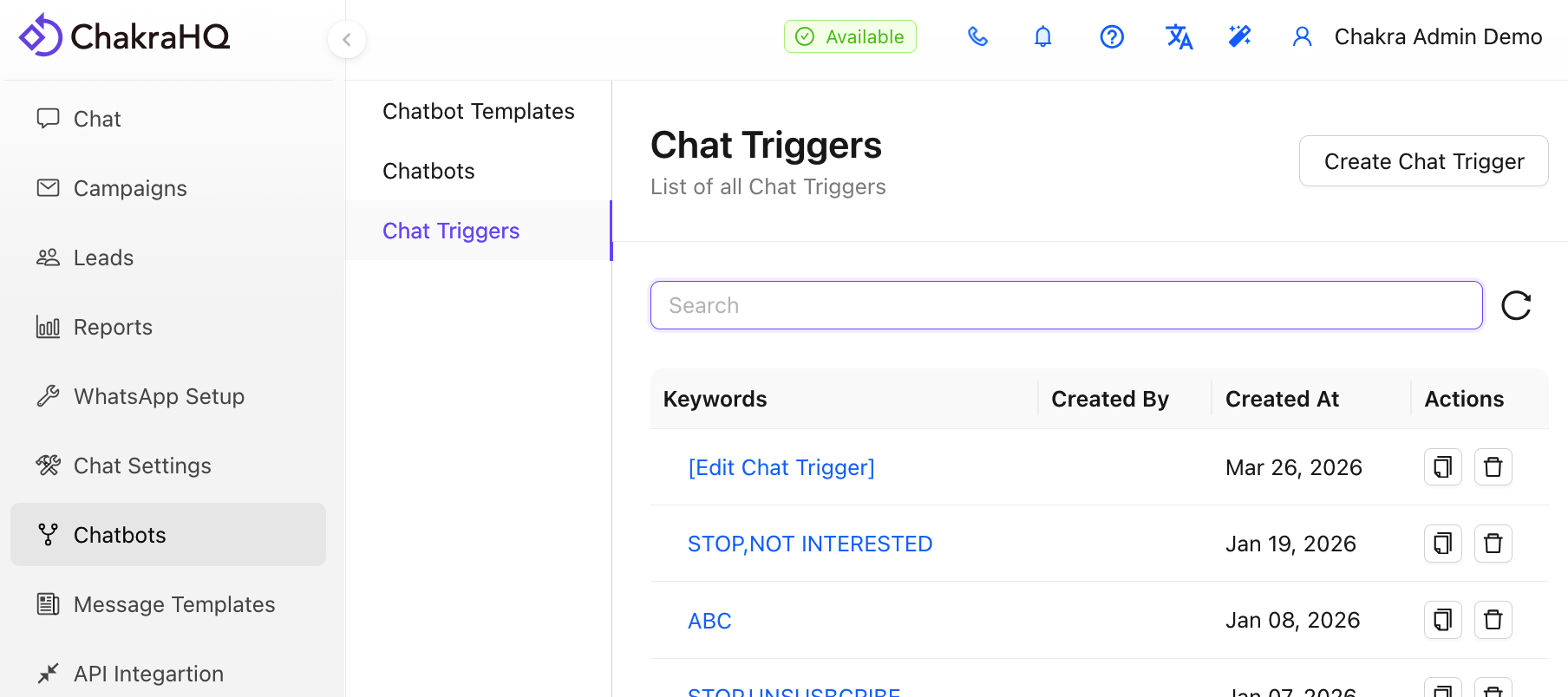 Triggering Eventnode, click on Edit _ 🖊_ on the right top - The Default Trigger is Chat Updation. To Add additional filter rules configure the Event