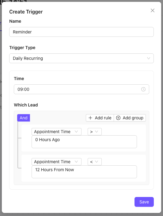 Now every day at 9 am,this trigger will find all leads whose appointment time is between 9am and 9pm and send them the reminder message.