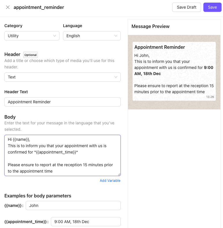 This guide explains how to set up automated appointment reminders for customers using the Campaigns feature. Follow these steps to capture appointment timestamp, create appointment reminder templates and configure the campaign