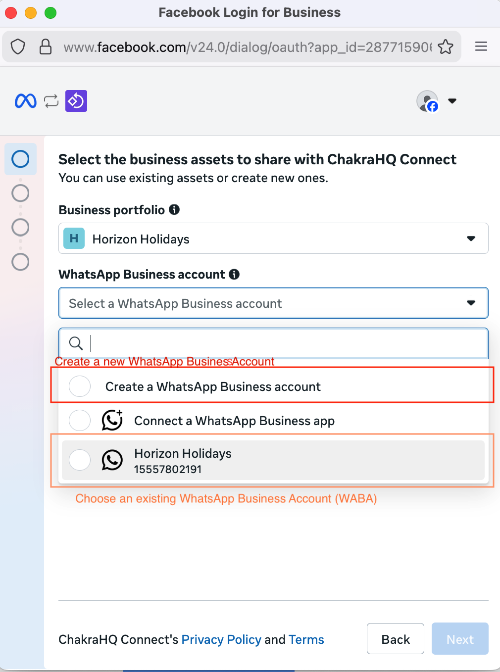 - This will create a new WhatsApp Business Account (WABA) and should generally not face an issue while you add your phone number in this new WABA
