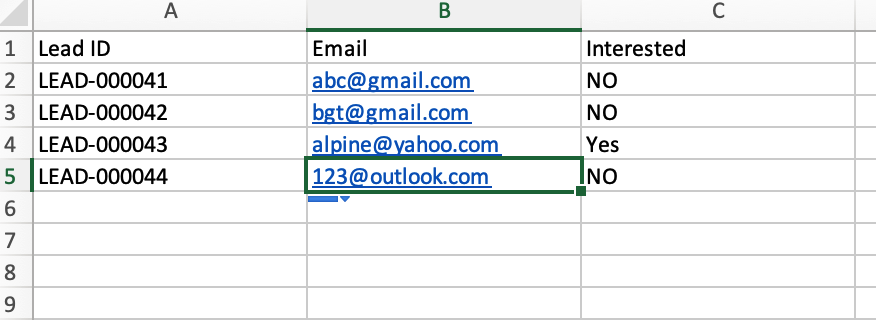 Lead ID(exactly this spelling and case). - Do not change or remove any Lead IDs.