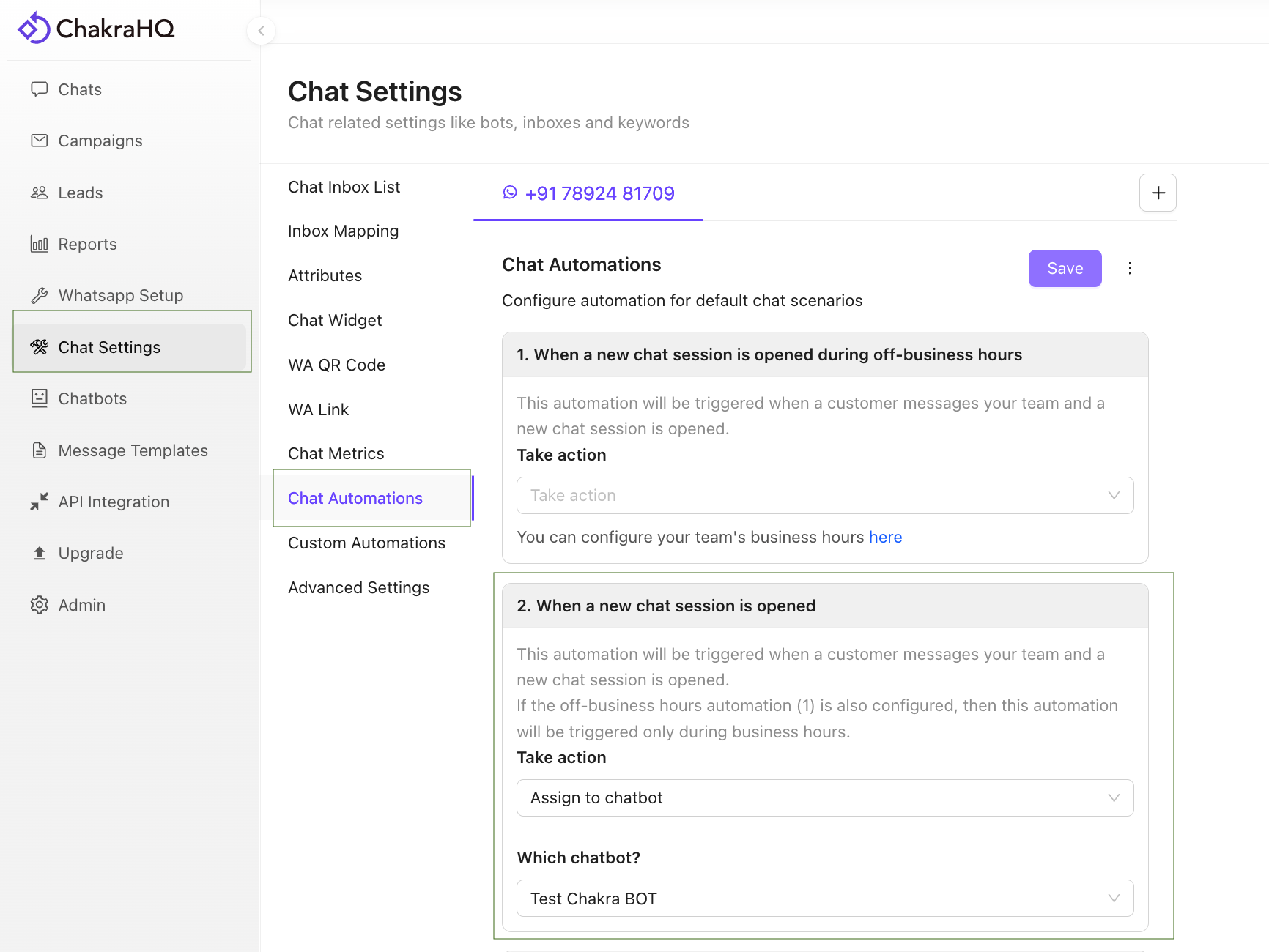 - When a new chat session is opened: This automation will be triggered when a customer messages your team and a new chat session is opened. If the off-business hours automation (1) is also configured, then this automation will be triggered only during business hours.