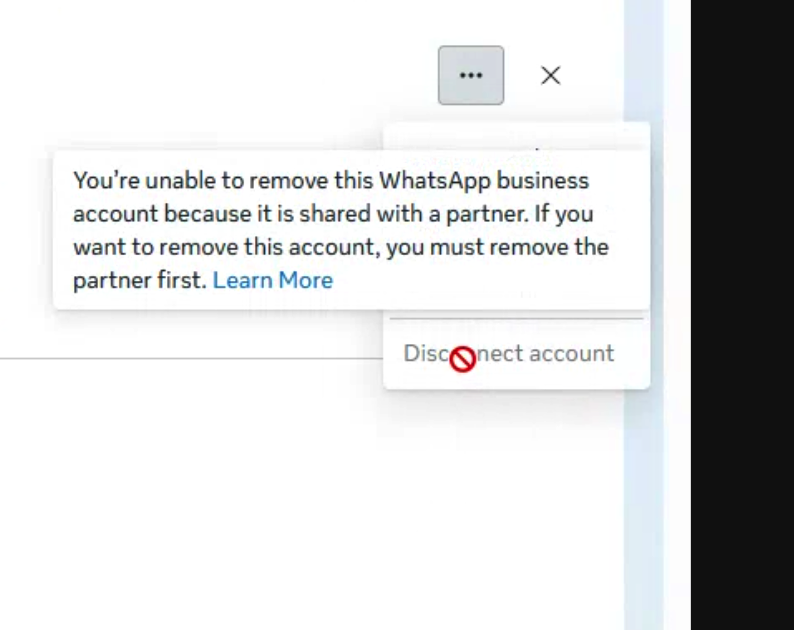 - If deleting the number is not allowed due to "You're unable to remove this WhatsApp business account because it is shared with a partner. If you want to remove this account, you must remove the partner first."
