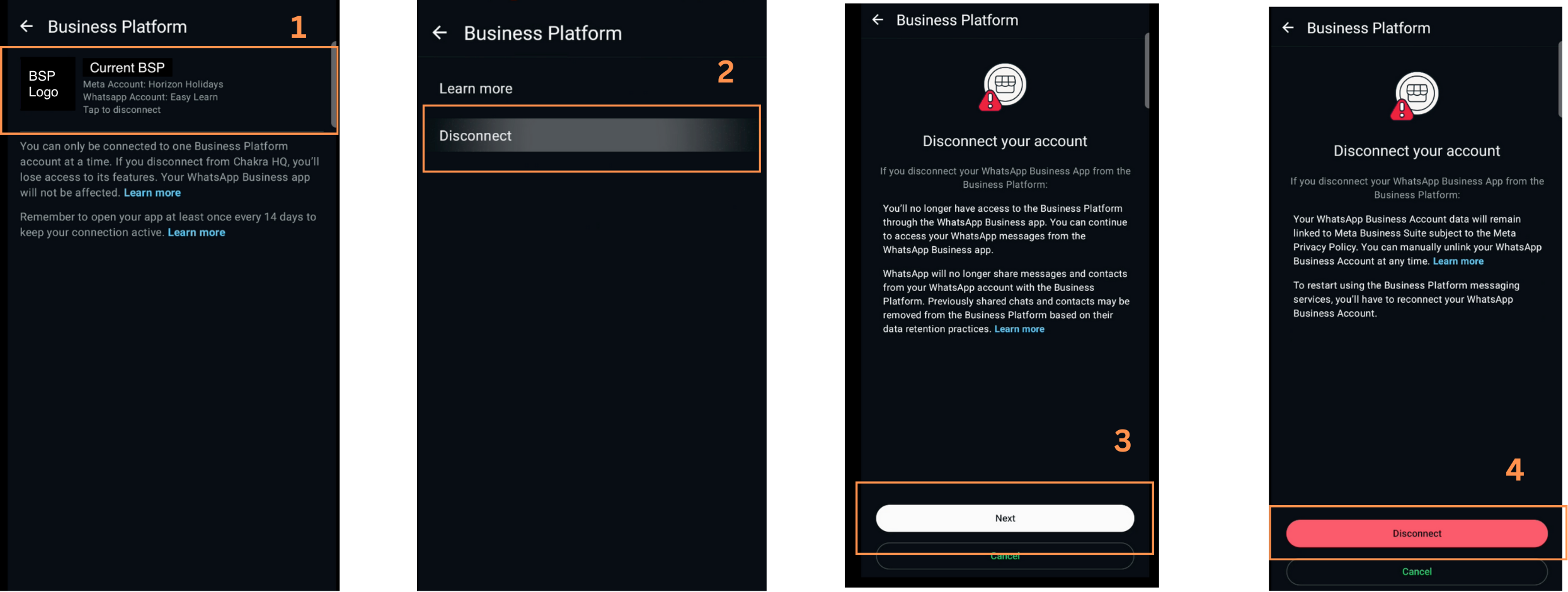 Go to your WhatsApp Business App. If you notice your previous BSP app connected in the WhatsApp business platform, disconnect it.