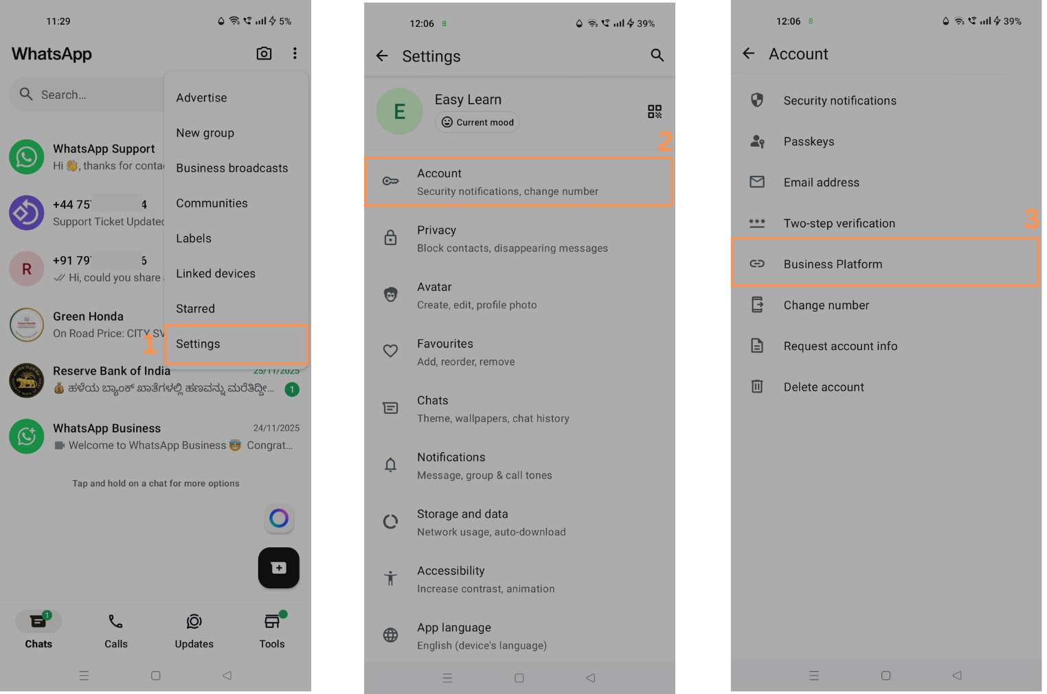 - Go to the WhatsApp Business App. In Settings -> Account -> Business Platform
