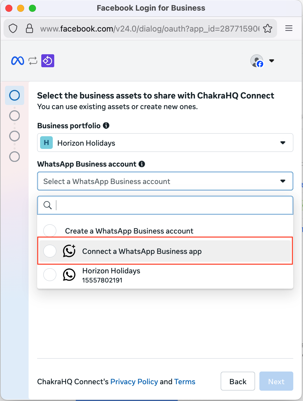Select Connect a WhatsApp Business app option for connecting your WhatsApp Business app using Coexistence (CoEx)