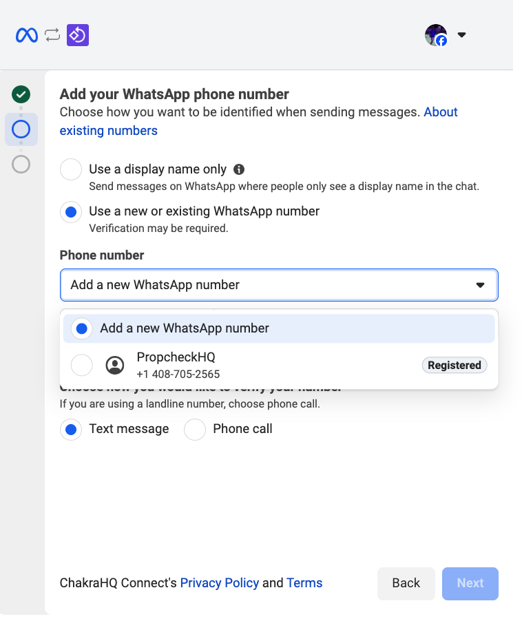 In the Add your WhatsApp phone number section, choose Use a new or existing WhatsApp number option and in the phone number field, use the existing number.