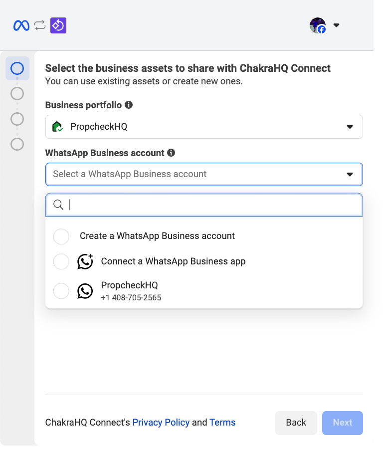 In the Select the business assets to share with ChakraHQ Connect section,choose appropriate portfolio and the existing WhatsApp Business Account in the dropdown
