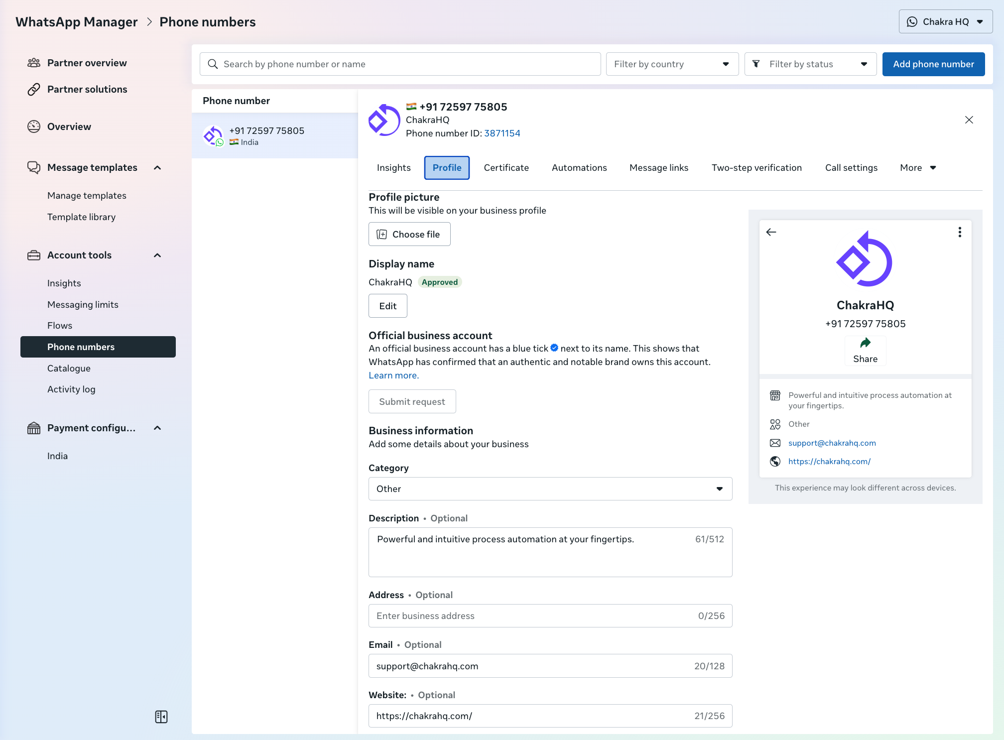 End: If you encounter any WhatsApp setup-related issues or status not verified, please reach out to Chakra at support@chakrahq.com