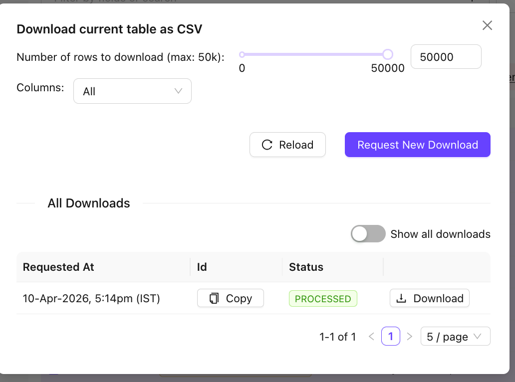 All Downloadssection - Once the Status is PROCESSES the data can be downloaded