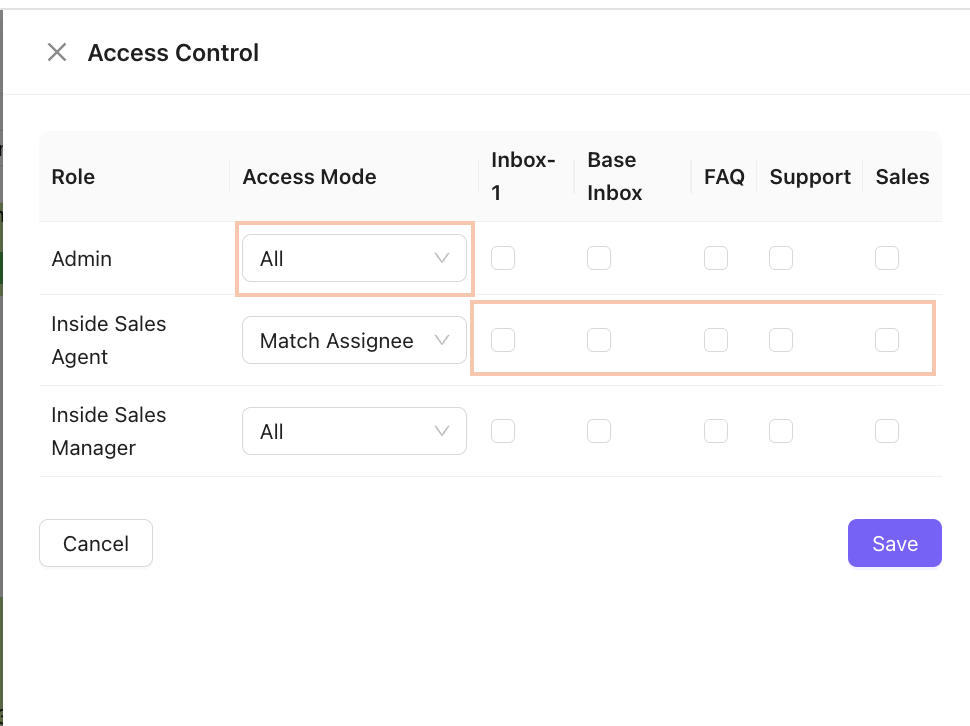 Select access mode- Match assignee and check the specific inbox - To give access to All chats of all inboxes