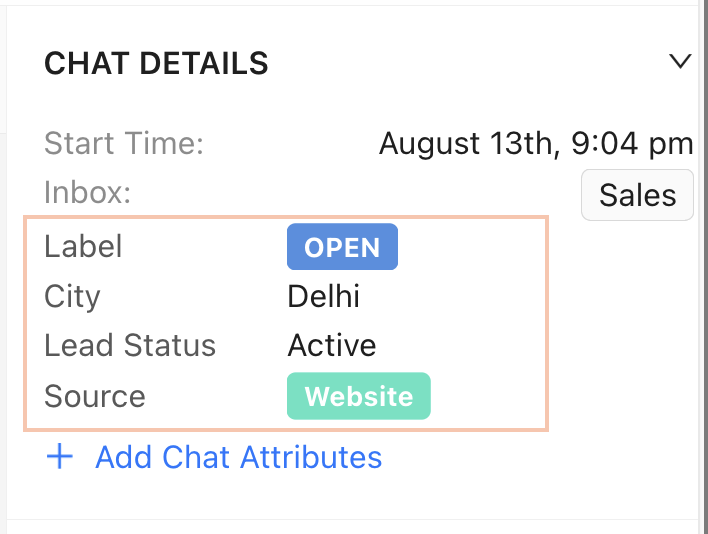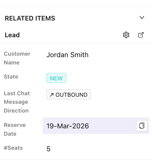 Displays the associated lead, automatically created for new chats. Click Details to access the lead.