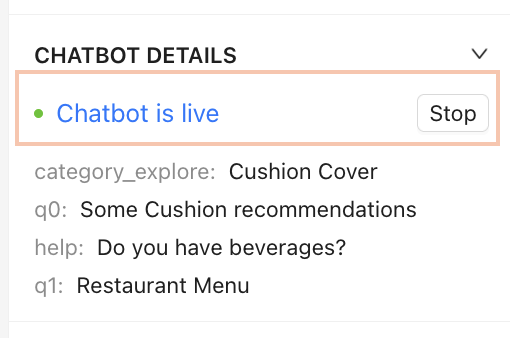 - Active Live Chatbot: Manually 'stop' the chatbot to engage customers directly. If no chatbot is currently active, a message